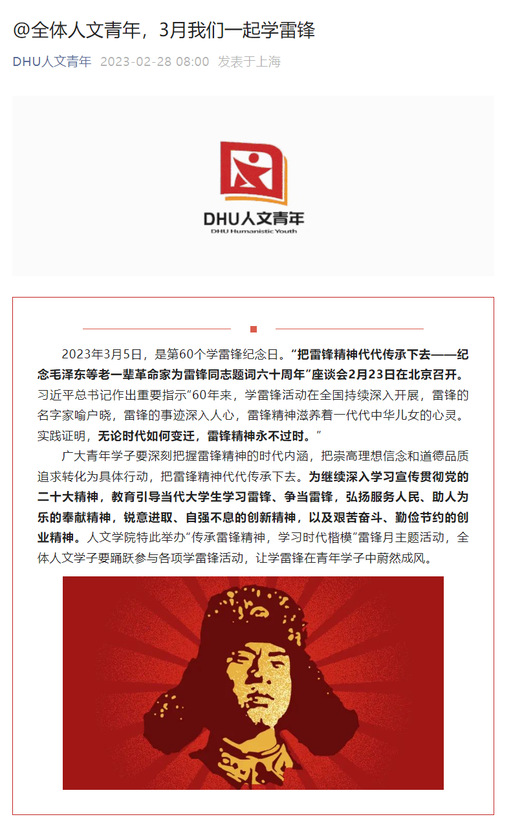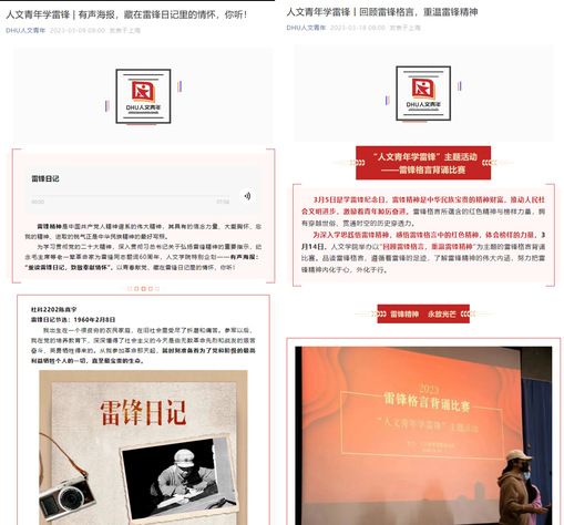 为学习贯彻习近平总书记对深入开展学雷锋活动作出的重要指示精神,人文学院组织学院各党员组织、青年学子深入开展“传承雷锋精神,学习时代楷模”雷锋月主题学习实践活动,引导学生通过主题党日、团日和特色志愿活动,深刻学习领会雷锋精神的时代内涵和实践要求,整合资源发布各类志愿服务活动信息,鼓励全体人文学子踊跃参与各项学雷锋活动,深入社区、场馆等,以志愿服务实际行动书写新时代雷锋故事,全力推动“学雷锋”在青年大学生中蔚然成风。