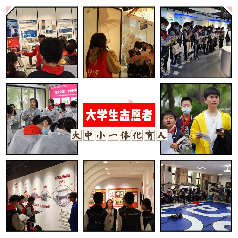除了大学教师,还有一批特殊的“老师”,他们便是大学生志愿者。大学生宣讲团也通过“大手牵小手”的方式为青少年筑梦。环境科学与工程学院、信息科学与技术学院、材料科学与工程学院、纺织学院、计算机科学与技术学院、校史馆、科技馆……每一个点位课程都有这样一群优秀的大学生助教承担了科普思政宣讲、实验指导、互动答疑的重任。他们来自校团委推荐的各学院优秀团学干部,统一身着黄色卫衣,沿路讲解大学文化,用自己的成长故事激励中学生向上拔节,成为了各条行走线路的“引路人”。